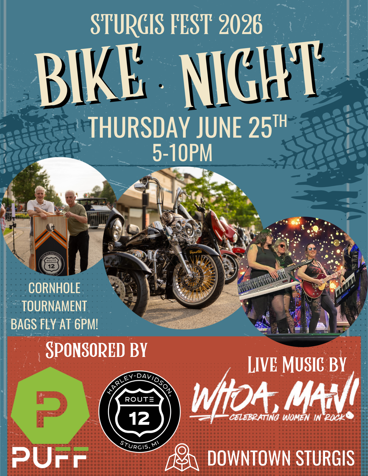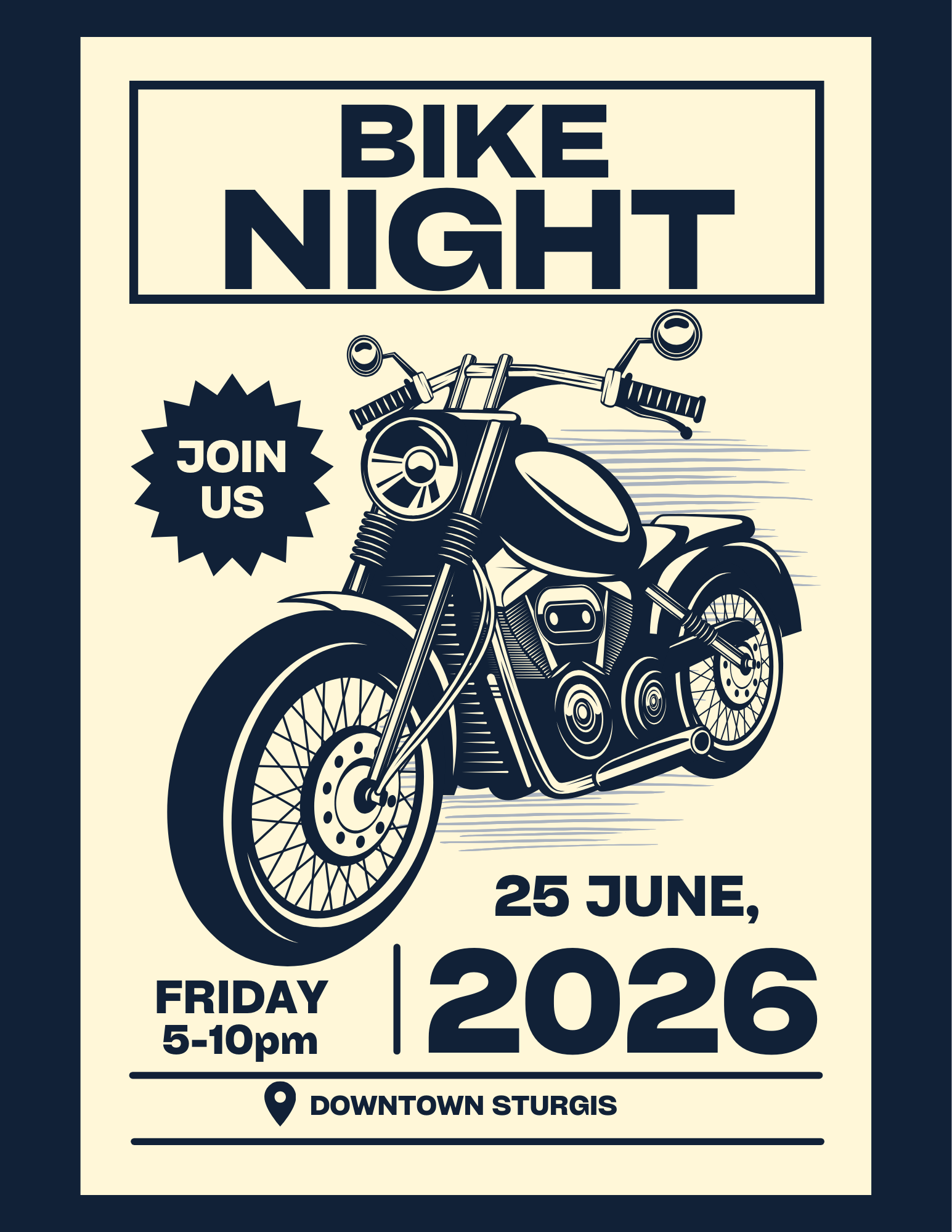 Bike Night this year is expected to be great turn out! Downtown Sturgis will be closed for Bike Parking only! There will be a live, classic rock band “Whoa, Man”, beer tent at Free Church Park, as well as food truck vendors on Arkwright Lot. Get out on two wheels and enjoy the wind in your face and a rockin’ good time with friend’s downtown! Make sure to come back and check details as they will be announced throughout the preparation of Sturgis Fest.