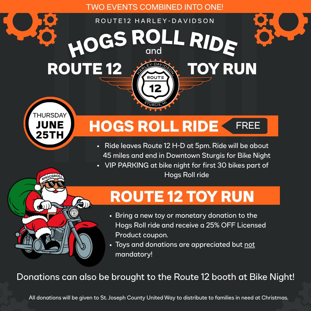 Interested in joining us for a ride? Route 12 Harley-Davidson will be sponsoring the “Hogs Roll Ride” from their location, 68951 White School Rd. Sturgis, MI 49091 at 6pm to our downtown, Sturgis Area.